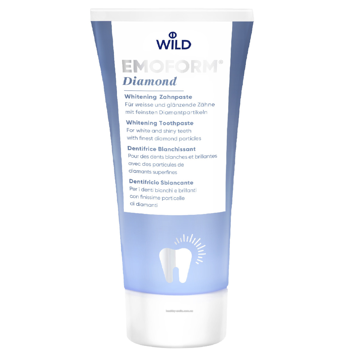 EMOFORM Diamond Toothpaste, which is the result of dental research by Dr. WILD. It contains the smallest particles of real diamond, which gently clean and polish the surface of the teeth, without irritating or injuring sensitive areas. Therefore, EMOFORM Diamond is especially suitable for achieving natural whiteness in patients with hypersensitivity of the necks of the teeth. The result is a noticeably smoother and whiter surface of the teeth, which further prevents the formation of plaque and, as a consequence, tartar.