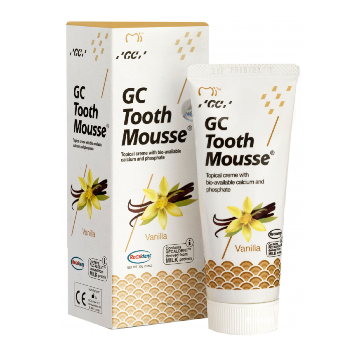 Tooth Mousse Enamel GC Goth Tooth Mousse is a delicious cream that is also good for teeth. The composition of Toussaint Mousse cream includes calcium and phosphates, the main minerals of teeth. Minerals are presented in soluble form, special milk - the resulting protein known as Recaldent TM (CPP-ACP). Tooth Mousse Enamel Recovery Gel helps protect teeth by replacing calcium and phosphate lost when teeth are exposed to acids from food and drink. Tooth Mousse cream without fluorides. If your dentist recommends extra fluoride intake, you can safely use Tooth Mousse and fluoride products at the same time.