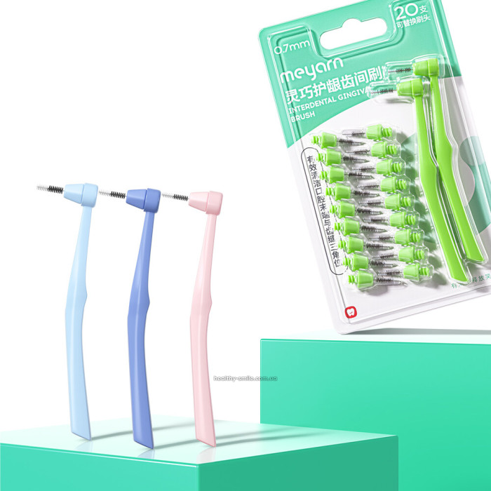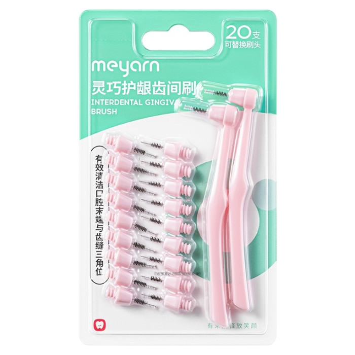 Набір міжзубних щіток Meyarn включає 20 змінних міні-щіток з тонким металевим стрижнем та м’якими щетинками діаметром 0.5 мм. Щітки ефективно очищають простір між зубами, навколо брекетів і вздовж лінії ясен, запобігаючи накопиченню нальоту та залишків їжі.